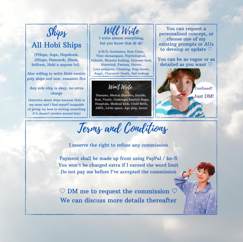 In this house, you will find both SFW and NSFW fics. My favourite genre is slice of life and my favourite AUS include omegaverse, college, and soulmates. I like experimenting with genres, so you'll see me dabbling in a bit of everything here and there. I don't do halfies. If I tag angst, it's not a drill lol. Same goes for fluff though, so we're evened out.The blood in my veins is made of Hobi harem. I love all Hobi ships and Hobi centric love triangles/polygons and polyamory ships, in every permutation and combination. I also like non romantic stories centered around Hobi. My favourite sexual dynamic to write is sub bottom Hobi.I also write the occasional hard kink. Rest assured, all my fics are tagged properly for your safety. I do not condone any of the malpractices portrayed in some of my fics. They are purely fiction, and should be taken as such.